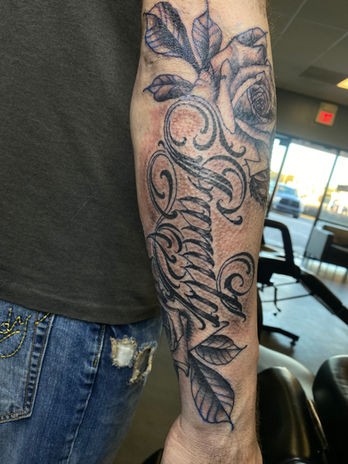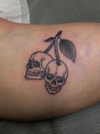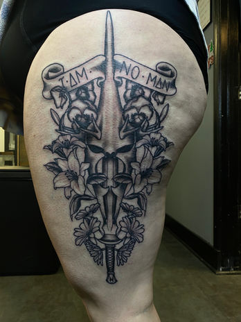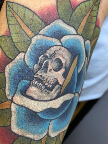 She is in the shop Tuesday thru Saturdays, and specializes in color, traditional, neo traditional, cover ups, and is down for any thing bizarre like a two headed duck or 3 headed dog! One of our favorites is the custom Bucee Tattoo she designed in 3 different styles for a group of friends!